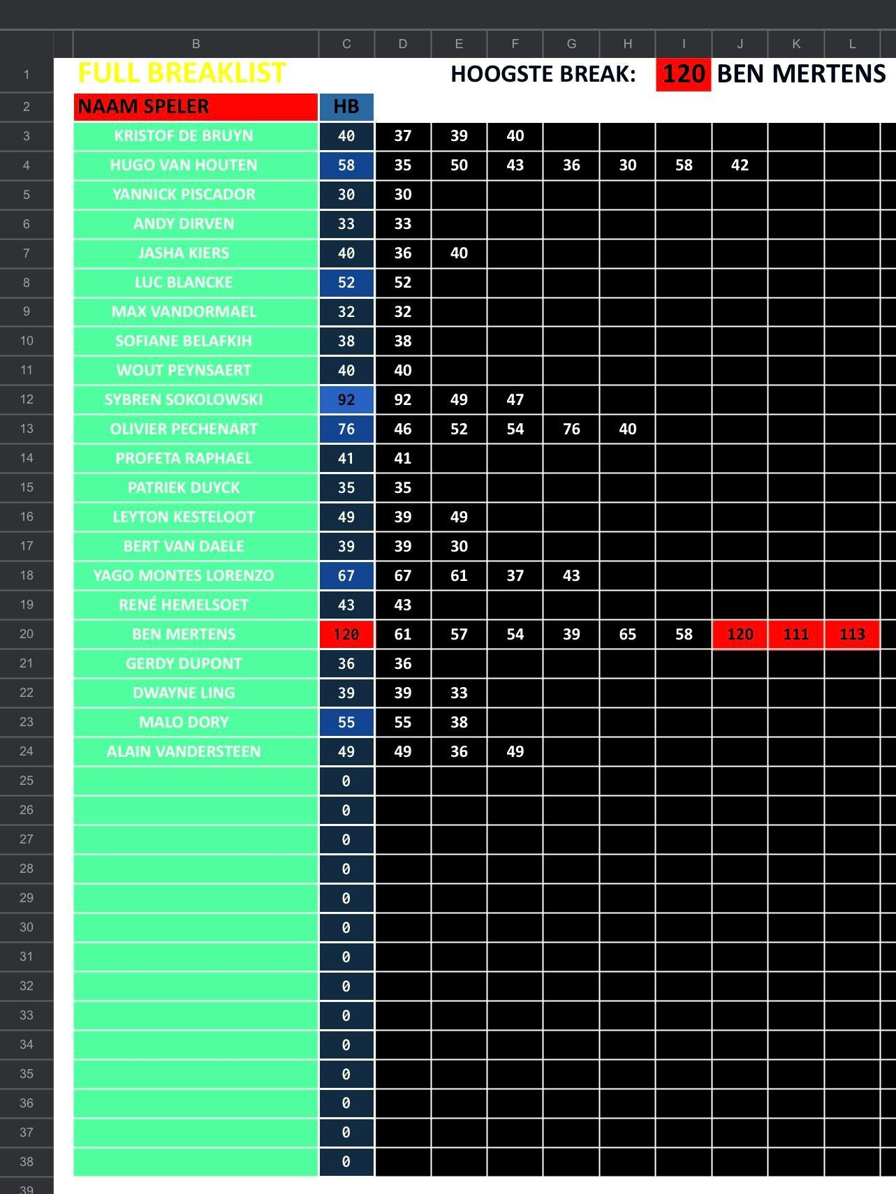 Ben maakte in zijn 3 gewonnen frames breaks van 110,111 en 120. Ik wist nog een framepje af te snoepen met 2 breakjes van 30, maar het was zeer mooi om te zien hoe elk minimaal foutje genadeloos werd afgestraft!